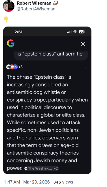 So you can imagine my shock when some influential Jewish voices from the larger community condemned this reference to “the Epstein Class” as anti-semitic. Really bro?