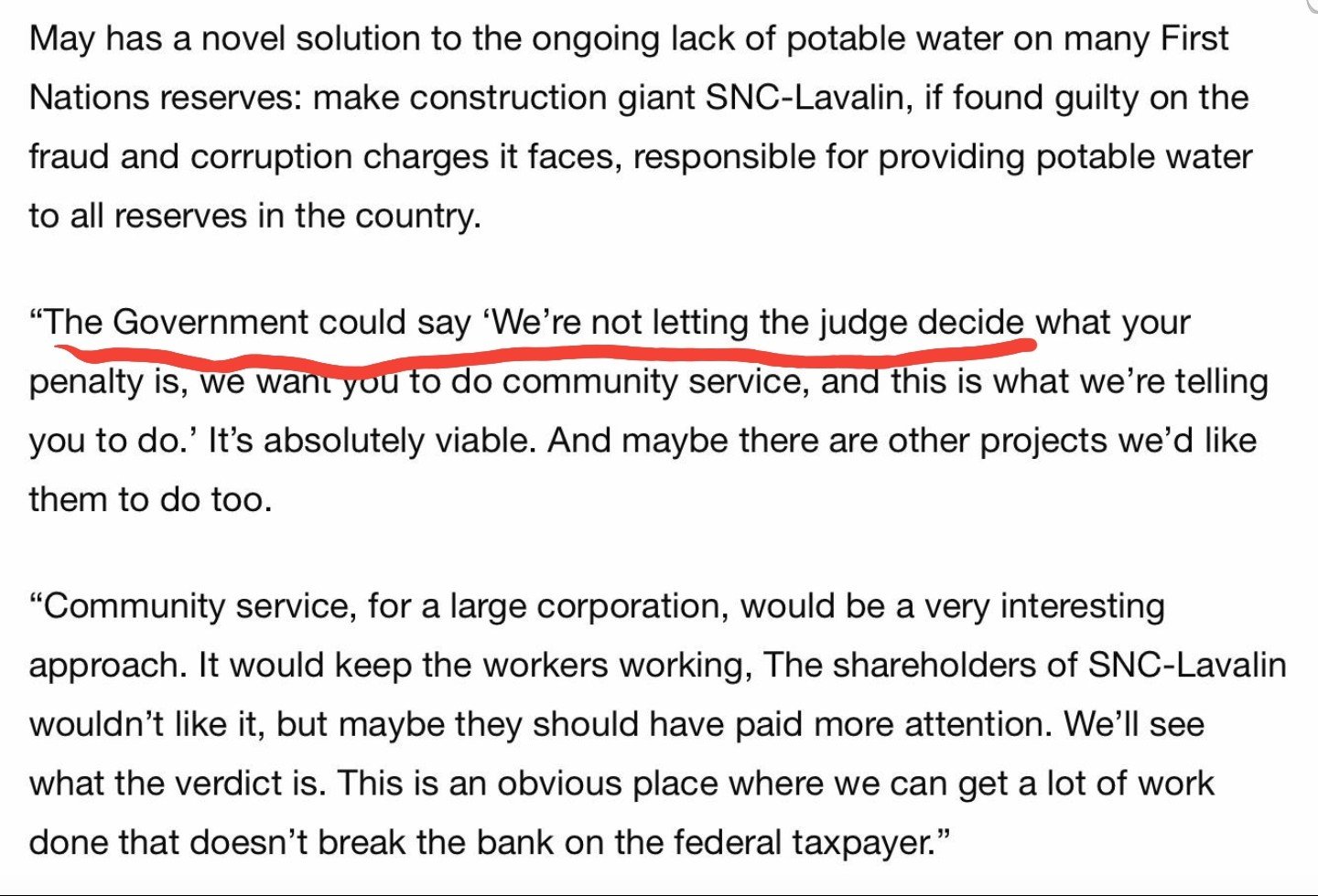 Elizabeth May chimed in with the notion that a corporation should be compelled into fixing these inadequate water systems as part of their sentencing as a means of “corporate restorative justice”; on their own coin to be sure.